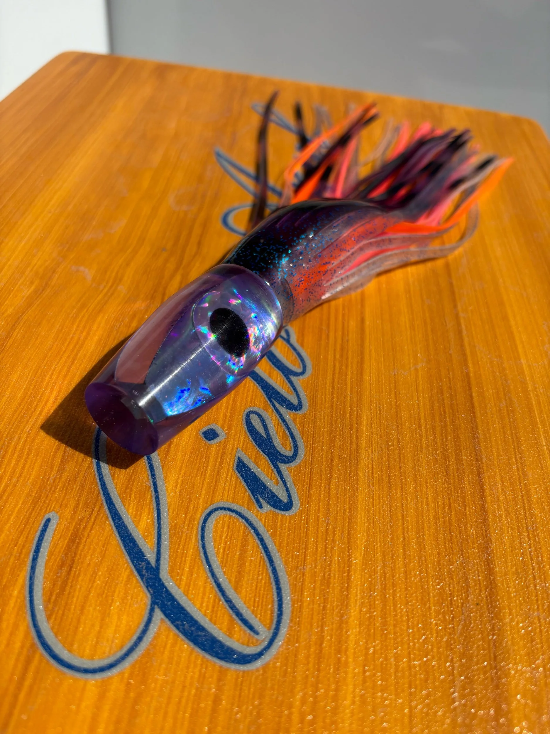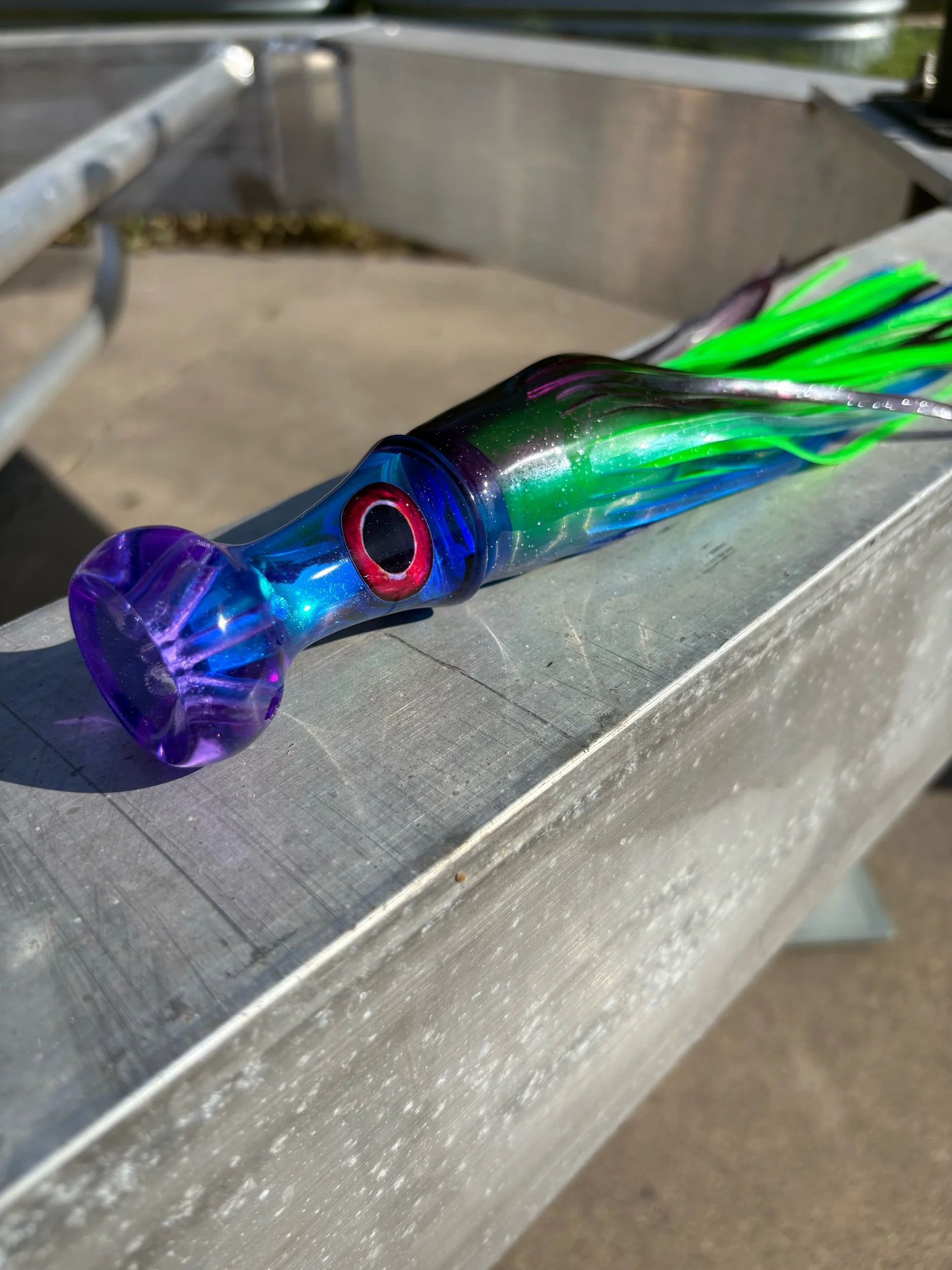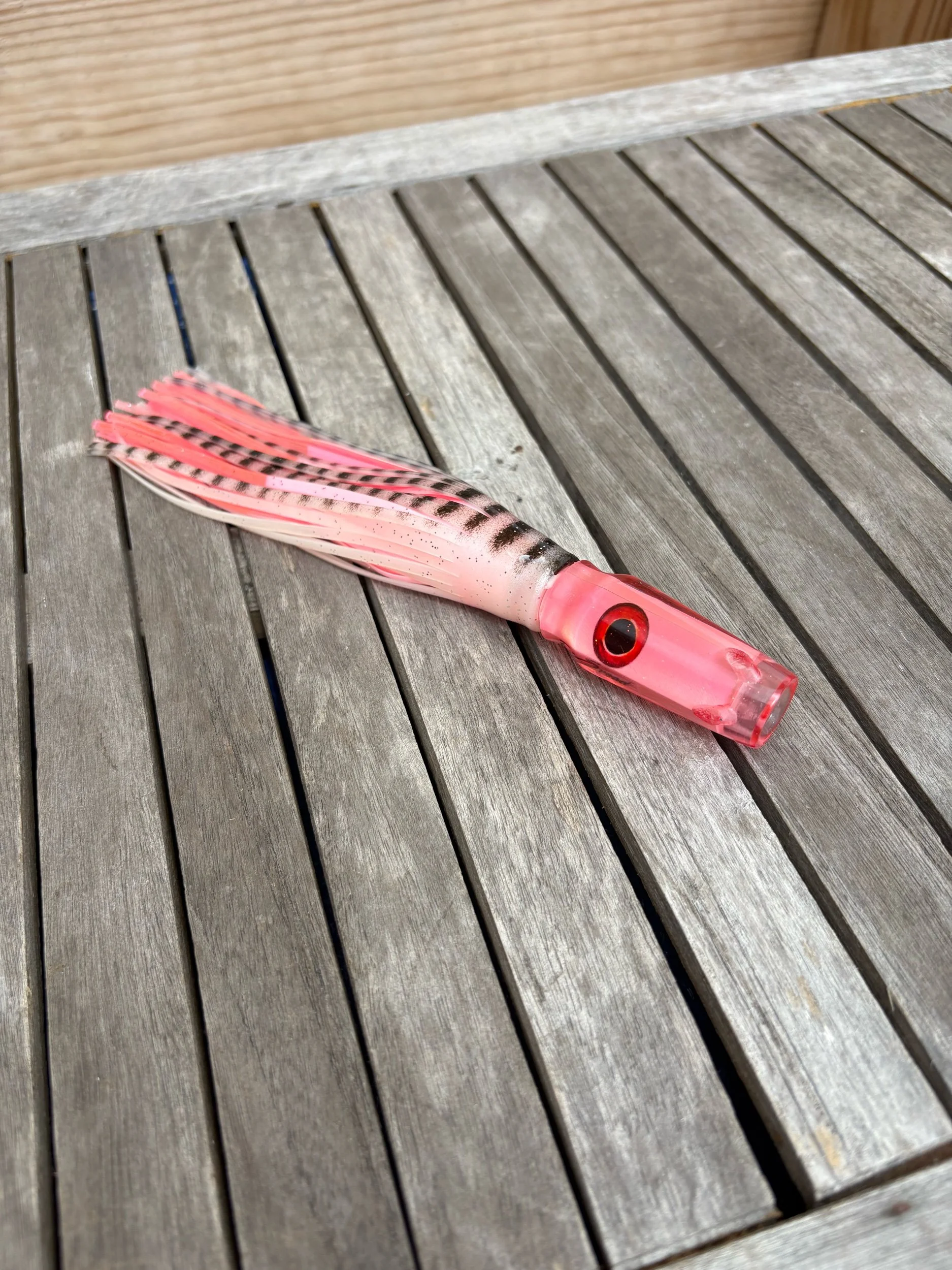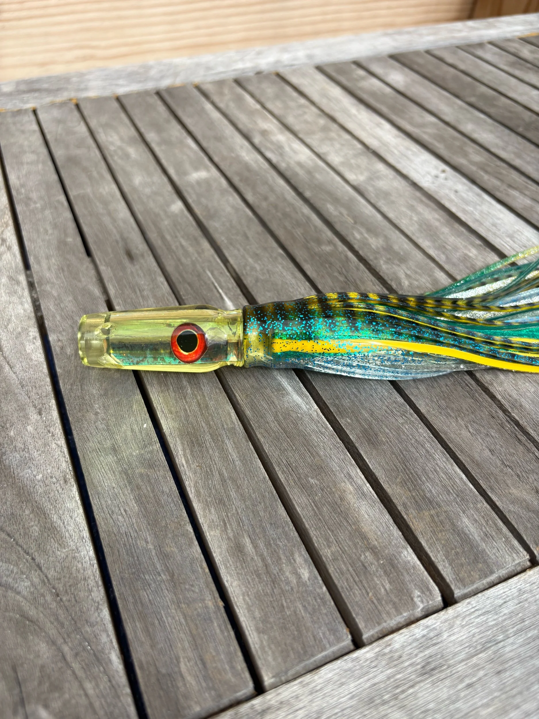 This light tackle lure is easy to set in the spread and pull in all-weather conditions. Has a nice, very tight head shake and produces plenty of smoke to attract the big girls. Primarily irresistible to meat fish but has seen its fair share of billfish action.