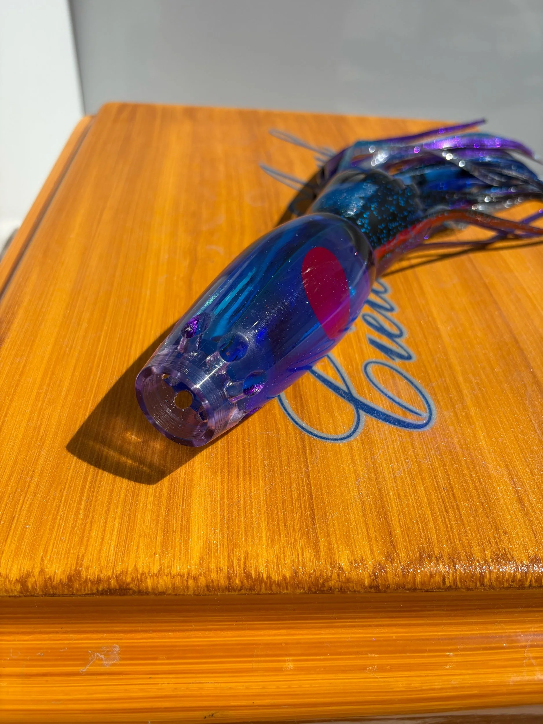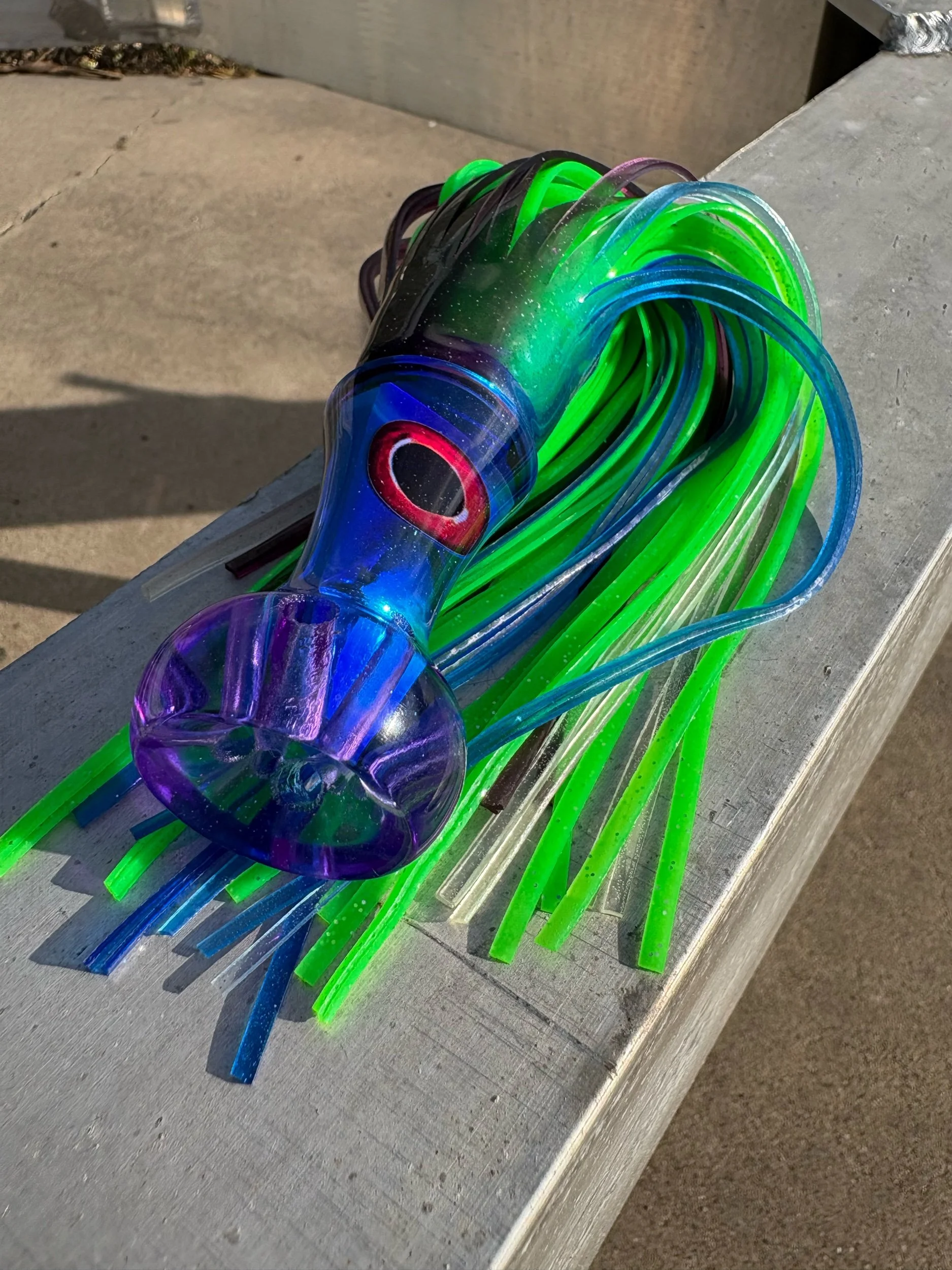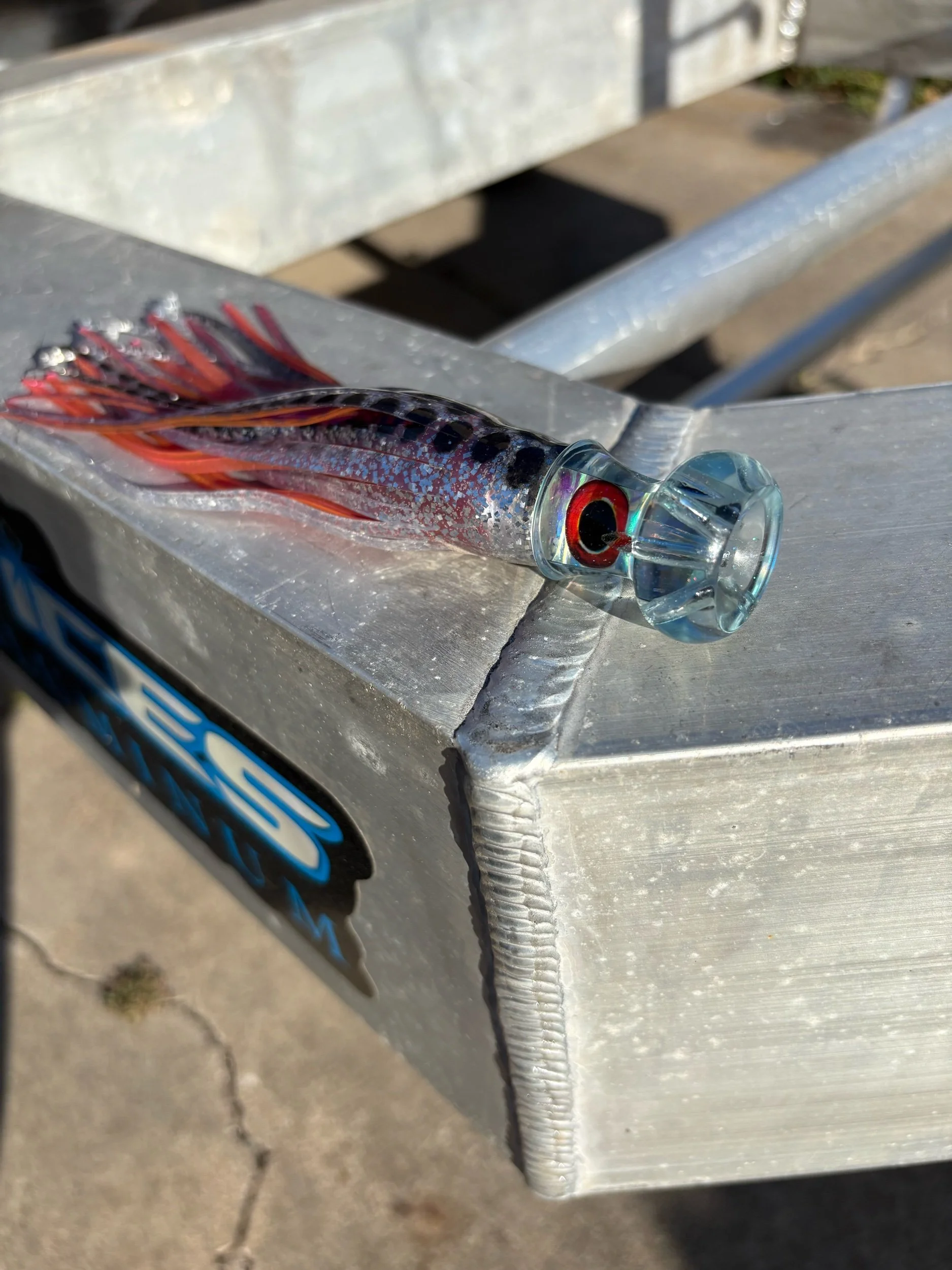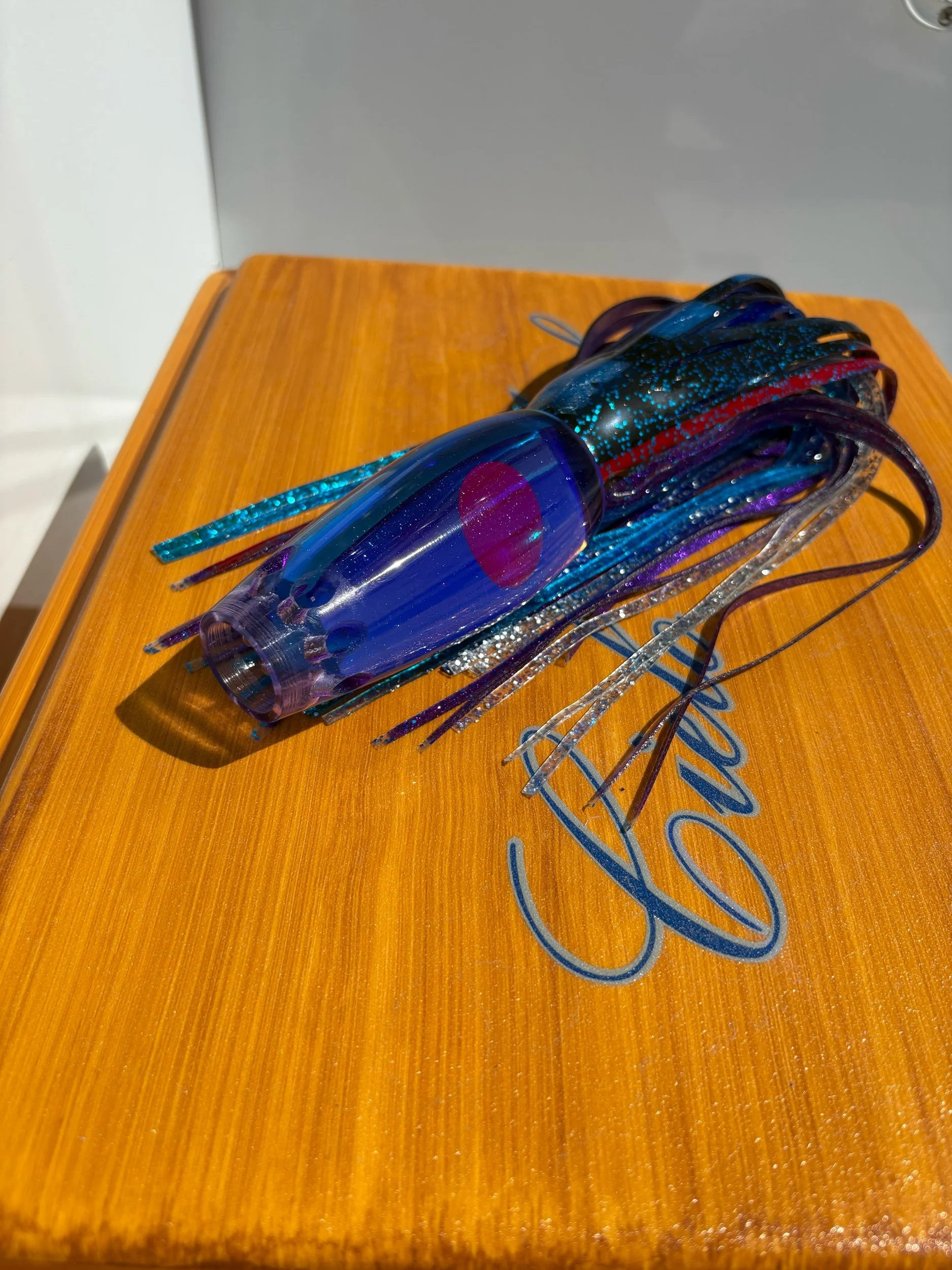 This is an aggressive surface running lure. Produces a lot of smoke and wild head shaking. Unlike the smaller version this one is a little more difficult to set in the spread, she doesn’t like a lot of line angle and will try to come out of the water at the end of the cycle if the angle is too steep. I like to pull it from the short rigger position, she does need angle to cycle properly just not too much. When you get her set just right, she cycles beautifully. She is a fish raiser and will get the billfish fired up. Has passed the Blue Marlin test. I recommend using a loose hook rig.